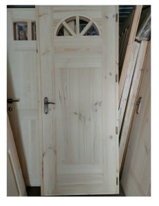 Деревянная дверь из массива сосны с полуаркой толщина полотна 50 мм, глубина коробки 80 мм, дверь идет в собранном состоянии с фурнитурой и стеклопакетом.При желании заказчика дверь можно выкрасить в любой цвет,покраска занимает 10 календарных дней.